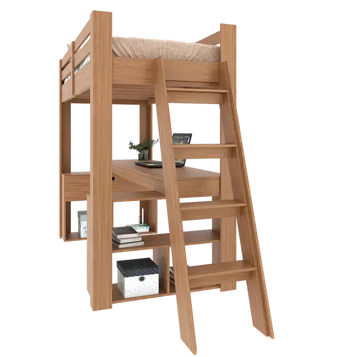O produto contém uma escada lateral que pode ser montada de ambos os lados, uma escrivaninha com cinco nichos, para a organização de diversos objetos, e um armário com porta basculante. Além de otimizar seu espaço, o design moderno do móvel e sua estrutura permitem que você possa executar suas atividades na parte inferior sem demais complicações.