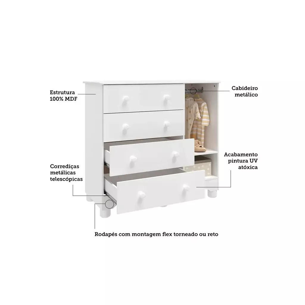 Desenvolvida para oferecer qualidade, beleza, conforto e segurança para toda família na hora de montar o quartinho do(a) bebê. Cômoda produzida com estrutura 100% MDF e acabamento em pintura UV atóxica. Possui 1 porta com janela em PETG Cristal/Acrílico, que permitem visualizar parte interna do móvel, 4 gavetas que deslizam sob corrediças metálicas telescópicas, 1 prateleira que suporta até 5kg, puxadores e pés em plástico. Acompanham o produto, 2 opções de rodapés, um usinado (torneado) e outro reto, para que você escolha no momento da montagem qual se adequa ao estilo do ambiente. Aproveite para adquirir a sua agora! Dimensões